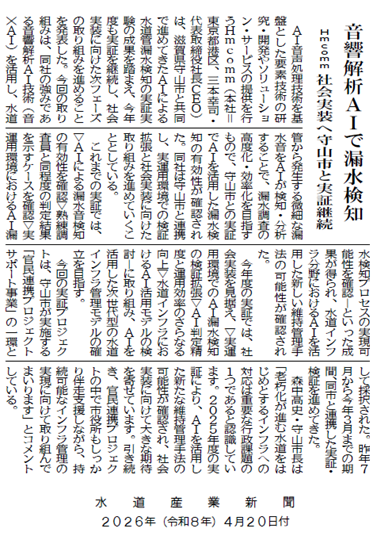異音検知AIによるインフラメンテナンスDXに取り組むHmcomm株式会社(本社:東京都港区、代表取締役社長 CEO:三本 幸司、以下、Hmcomm)は、滋賀県守山市と共同で進めているAIによる水道管漏水検知に関する取り組みが、水道業界専門紙である「水道産業新聞(2026年4月20日付)」に掲載されたことをお知らせいたします。